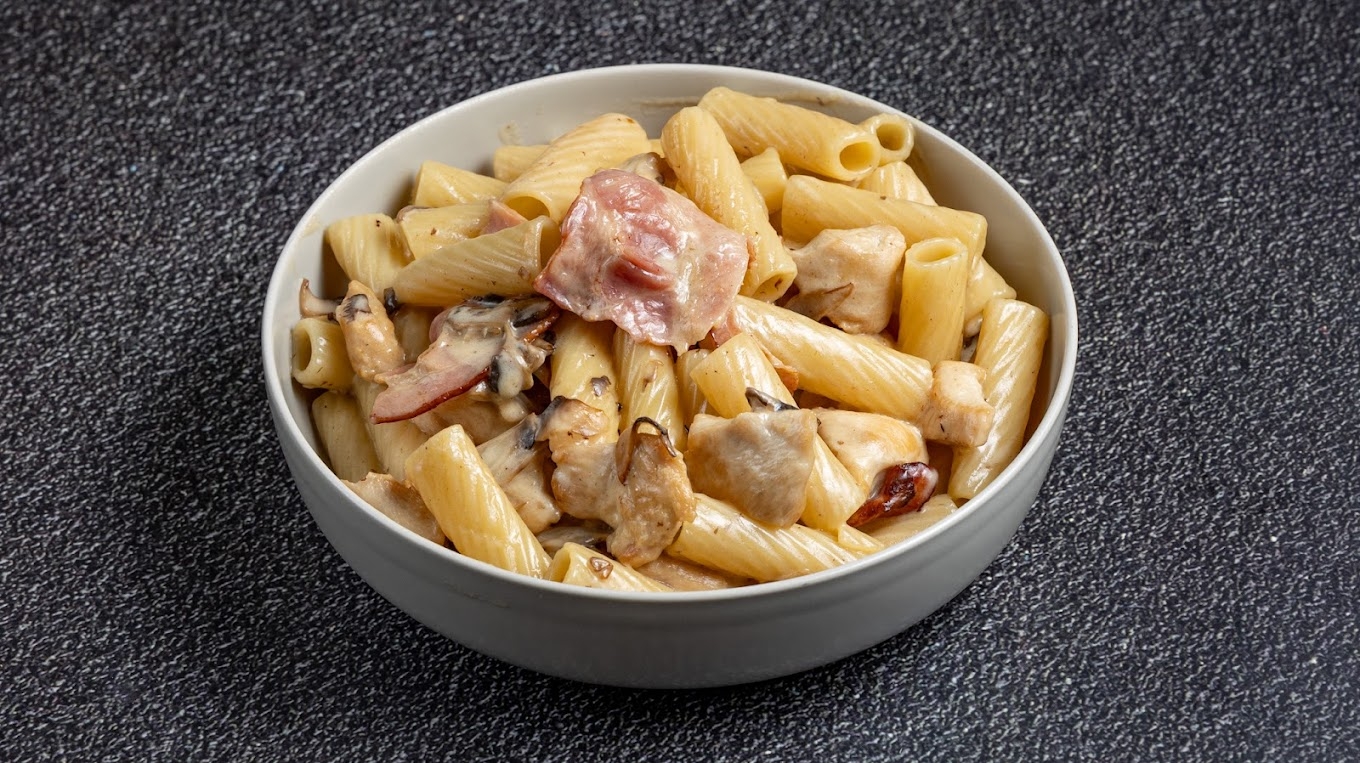 With cream, Parmesan, fresh mushrooms, roasted chicken, and bacon.