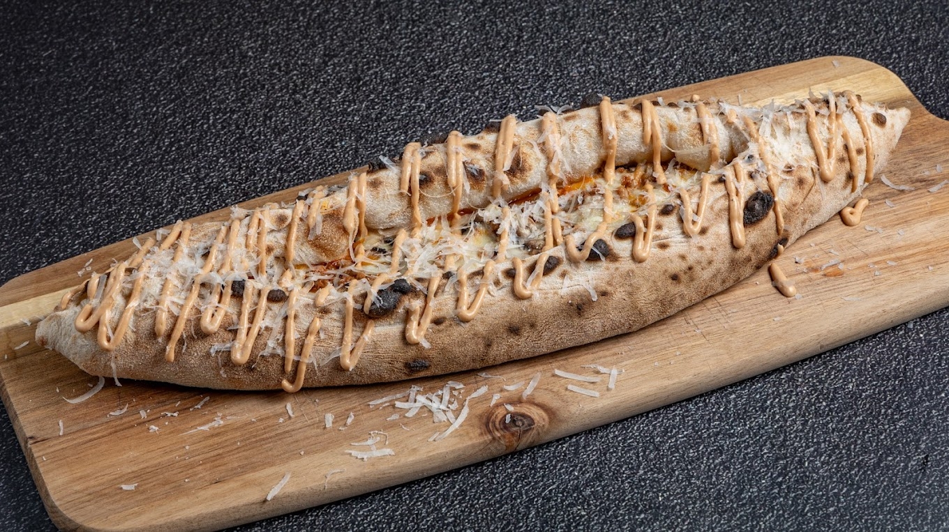 With spicy sausage, tomato sauce, grated Gouda, mozzarella, homemade chili oil, and fresh oregano...