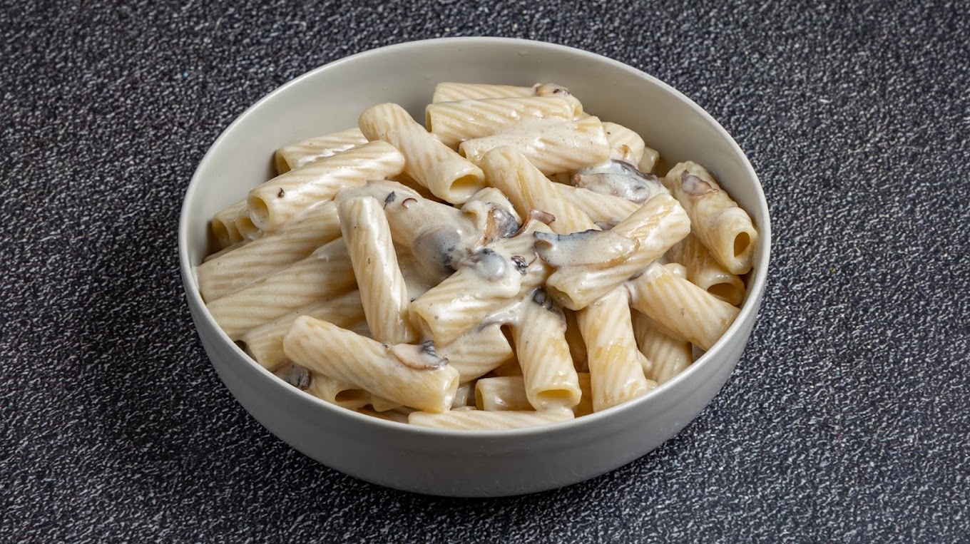 With cream, Parmesan, fresh mushrooms, Gorgonzola, and white truffle oil.