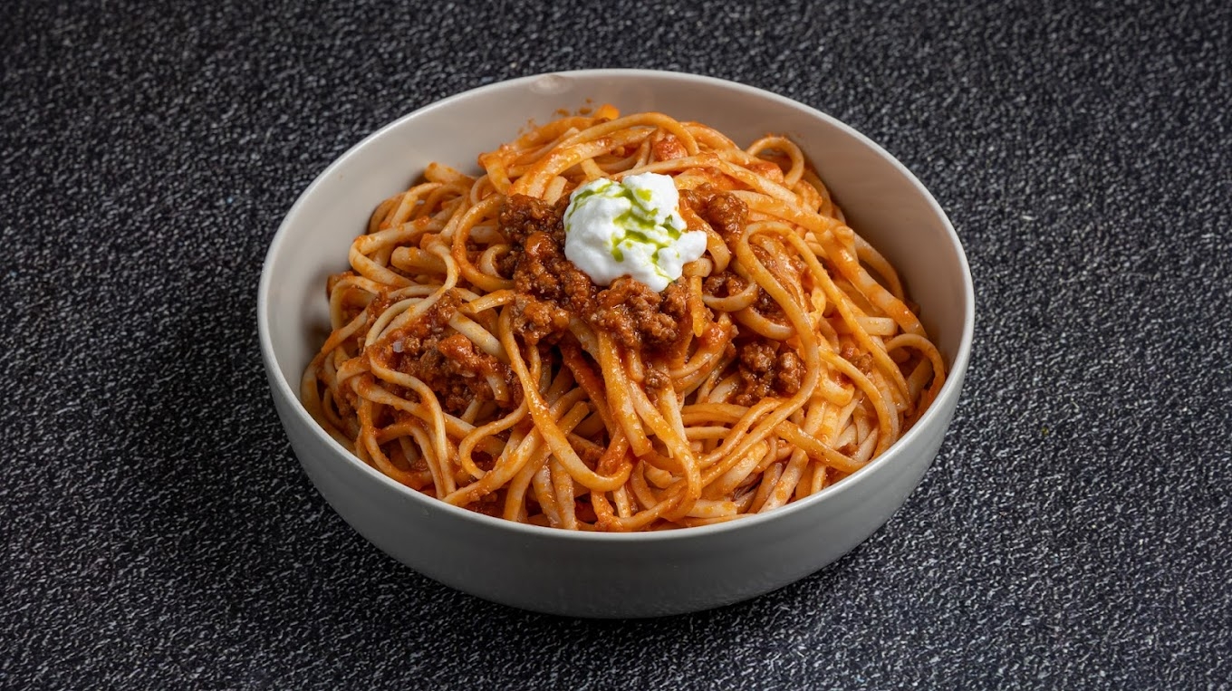 With tomato sauce, fresh peperoncino, homemade chili oil, and Parmesan.