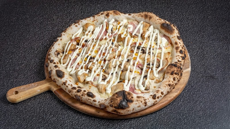 With cream, roasted fresh chicken, mushrooms, Caesar's cream, mozzarella, grated Gouda, grated...